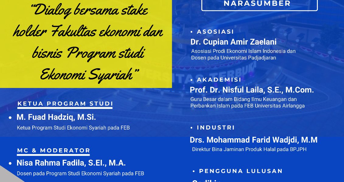 Dalam sambutannya, Dekan Fakultas Ekonomi dan Bisnis Universitas Terbuka (FEB-UT) menegaskan bahwa Dialog Stakeholder merupakan instrumen strategis dalam menjamin mutu akademik sekaligus memperkuat relevansi Program Studi Ekonomi Syariah. Kurikulum tidak hanya dituntut memenuhi standar akademik dan regulasi pendidikan tinggi, tetapi juga harus mampu merespons secara adaptif dinamika industri keuangan syariah, perkembangan kebijakan fiskal dan industri halal, serta tantangan transformasi ekonomi digital yang semakin kompleks.